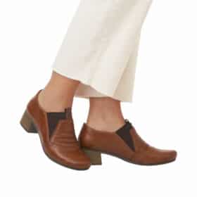 Rieker sko til dame i brun. Her introduceres en elegant sko fra Rieker i en smigrende brun tone, lavet af ægte skind og udstyret med elastik i siderne for lethed ved på- og afklædning. Skoen præsenterer en behagelig blokhæl på cirka 4 cm og er designet med fokus på letvægt, hvilket gør, at du næsten ikke bemærker, at du har den på. En funktionel og komfortabel sko, der forener elegance med praktisk brug.